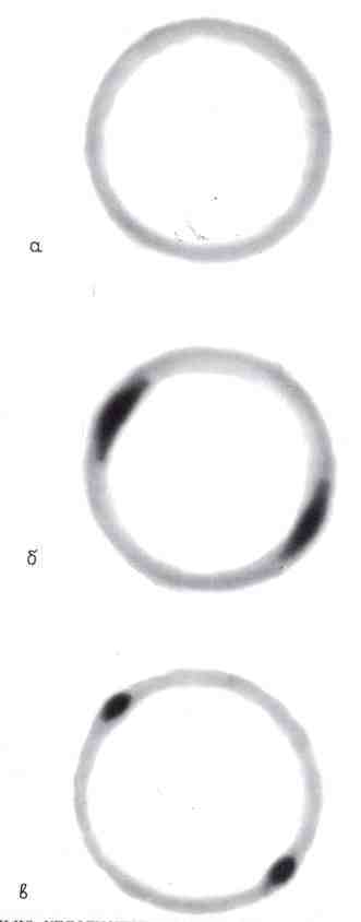 Рис. 13.3. «Кольцо уплотнения», возникновение которого показано на рис. 13.2, в плане; масштаб увеличен примерно втрое по сравнению с предыдущим рисунком. Через несколько сотен тысяч лет образуются два уплотнения, из которых могут возникнуть две звезды, образующие широкую двойную систему.