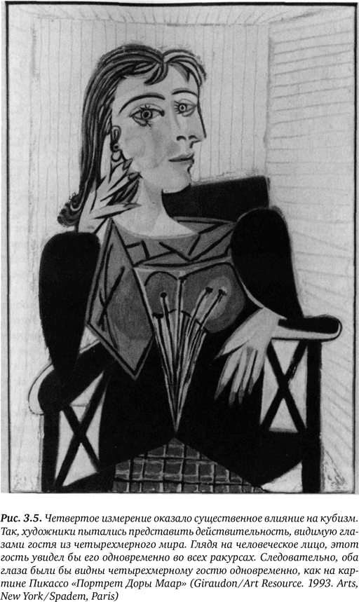 Прекрасный пример тому — картины Пикассо, свидетельствующие о явном отрицании перспективы, картины с женскими лицами, видимыми под несколькими углами одновременно. Вместо единственной точки зрения картины Пикассо демонстрируют множество таких точек, словно написаны тем, кто находится в четвёртом измерении и может видеть несколько перспектив одновременно (рис. 3.5).