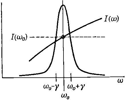 Фиг. 41.3. Сомножители подынтегрального выражения (41.10). Пик — это резонансная кривая 1/[(?-?0)2+(?2/4)]. Множитель I(?) можно с хорошим приближением заменить на I(?0).