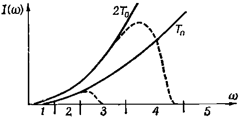 Фиг. 41.4. Распределение интенсивности излучения черного тела при двух температурах. Сплошные кривые — согласно классической теории; пунктирные — настоящее распределение, 1— paдuo ; 2 — инфракрасное; 3 — видимое; 4 — ультрафиолетовое; 5 — рентгеновские лучи.