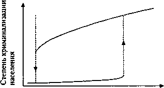 Если исходное состояние общества характеризуется низким уровнем криминальности и достаточной социальной защищенностью (нижняя кривая на левом рисунке), то ухудшение социальных условий должно приводить сначала лишь к небольшому росту доли уголовных элементов, но затем после достижения некоторого значения должна произойти резкая криминализация общества, причем она может быть обусловлена какими-то очень небольшими по масштабу событиями и изменениями в обстановке. И наоборот, если исходное состояние характеризуется довольно высоким уровнем криминальности (верхняя ветвь на левом рисунке), то даже существенное улучшение социальных условий (движение влево по оси абсцисс) лишь незначительно уменьшает долю криминальных элементов. Затем следует резкий спад к нижней ветви, социальные меры, которые раньше казались неэффективными, неожиданно приводят к значительному улучшению обстановки.