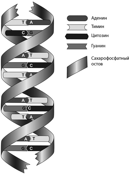 Молекула ДНК состоит из последовательно расположенных нуклеотидов, каждый из которых представляет собой сочетание сахарофосфатного остова, прикрепленного к одному из азотистых (нуклеотидных) оснований – аденину, цитозину, гуанину или тимину. Таким образом, ДНК предстает в форме винтовой лестницы, в которой нуклеотидные основания образуют «перекладины», а сахарофосфаты соединяются вместе, образуя грядки этой лестницы. Эти нуклеотидные основания образуют последовательности, сохраняющие генетическую информацию и инструкции для работы клетки, а также связываются с соседями на другой стороне лестницы по определенным правилам (как указано на диаграмме), что позволяет ДНК в точности воспроизводить себя после расщепления. (С разрешения Барбары Шеберл, Animated Earth LLC.)