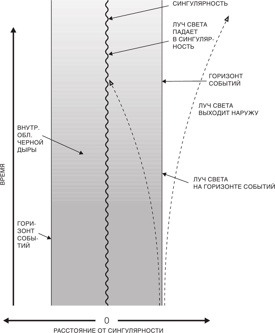 До 1970 г. в своих исследованиях по общей теории относительности я сосредоточивался в основном на вопросе о том, существовала или нет сингулярная точка Большого Взрыва. Но как-то вечером в ноябре 1970 г., вскоре после рождения моей дочери Люси, ложась спать, я задумался о черных дырах. Из-за своей немощности я очень медленно готовлюсь ко сну, и поэтому у меня было много времени для размышлений. Тогда еще не было точного определения, какие точки пространства-времени лежат внутри черной дыры, а какие – снаружи. Но мы уже обсуждали с Роджером Пенроузом определение черной дыры как множества событий, из которого невозможно уйти на большое расстояние. Это определение стало сейчас общепринятым. Оно означает, что границу черной дыры, горизонт событий, образуют в пространстве-времени пути лучей света, которые не отклоняются к сингулярности, но и не могут выйти за пределы черной дыры и обречены вечно балансировать на самом краю (рис. 7.1). Это как если бы, убегая от полицейского, держаться на шаг впереди, не будучи в силах совсем оторваться от него.