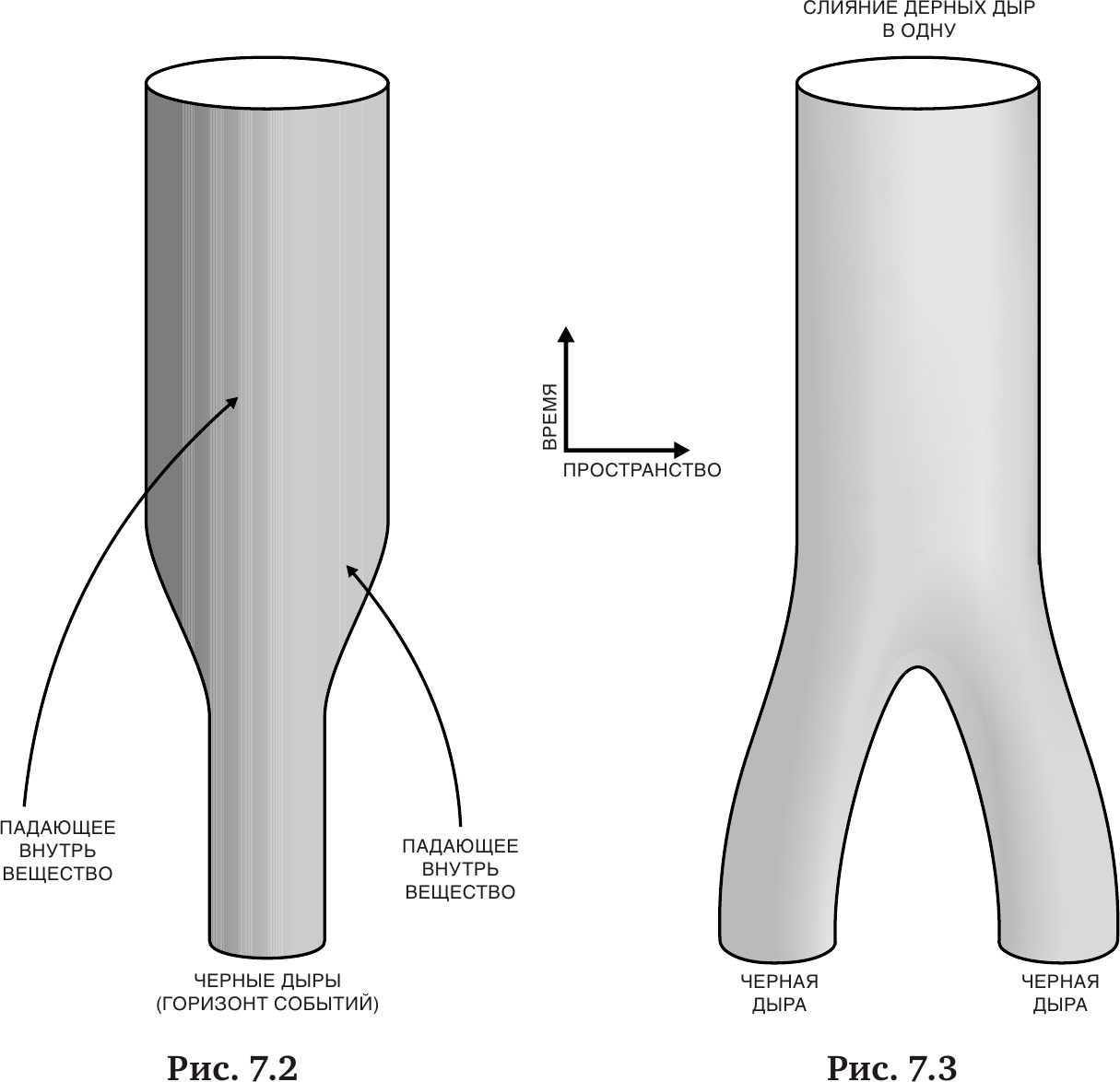Если лучи света, образующие горизонт событий, т. е. границу черной дыры, никогда не смогут сблизиться, то площадь горизонта событий может либо оставаться той же самой, либо увеличиваться со временем, но никогда не будет уменьшаться, потому что ее уменьшение означало бы, что по крайней мере некоторые лучи света на границе черной дыры должны сближаться. На самом деле эта площадь будет всегда увеличиваться при падении в черную дыру вещества или излучения (рис. 7.2). Если же две черные дыры столкнутся и сольются в одну, то площадь горизонта событий будет либо больше суммы площадей горизонтов событий исходных черных дыр, либо равна этой сумме (рис. 7.3). То, что площадь горизонта событий не уменьшается, налагает важное ограничение на возможное поведение черных дыр. Я был так возбужден сделанным открытием, что в ту ночь почти не спал. На следующий день я позвонил Роджеру Пенроузу. Он согласился с моими рассуждениями. Думаю, что на самом деле это свойство площадей Пенроузу было уже известно. Но он исходил из несколько иного определения черной дыры. Он не понял, что оба определения дают одинаковые границы черной дыры и, следовательно, одинаковые площади при условии, что черная дыра находится в состоянии, не изменяющемся со временем.