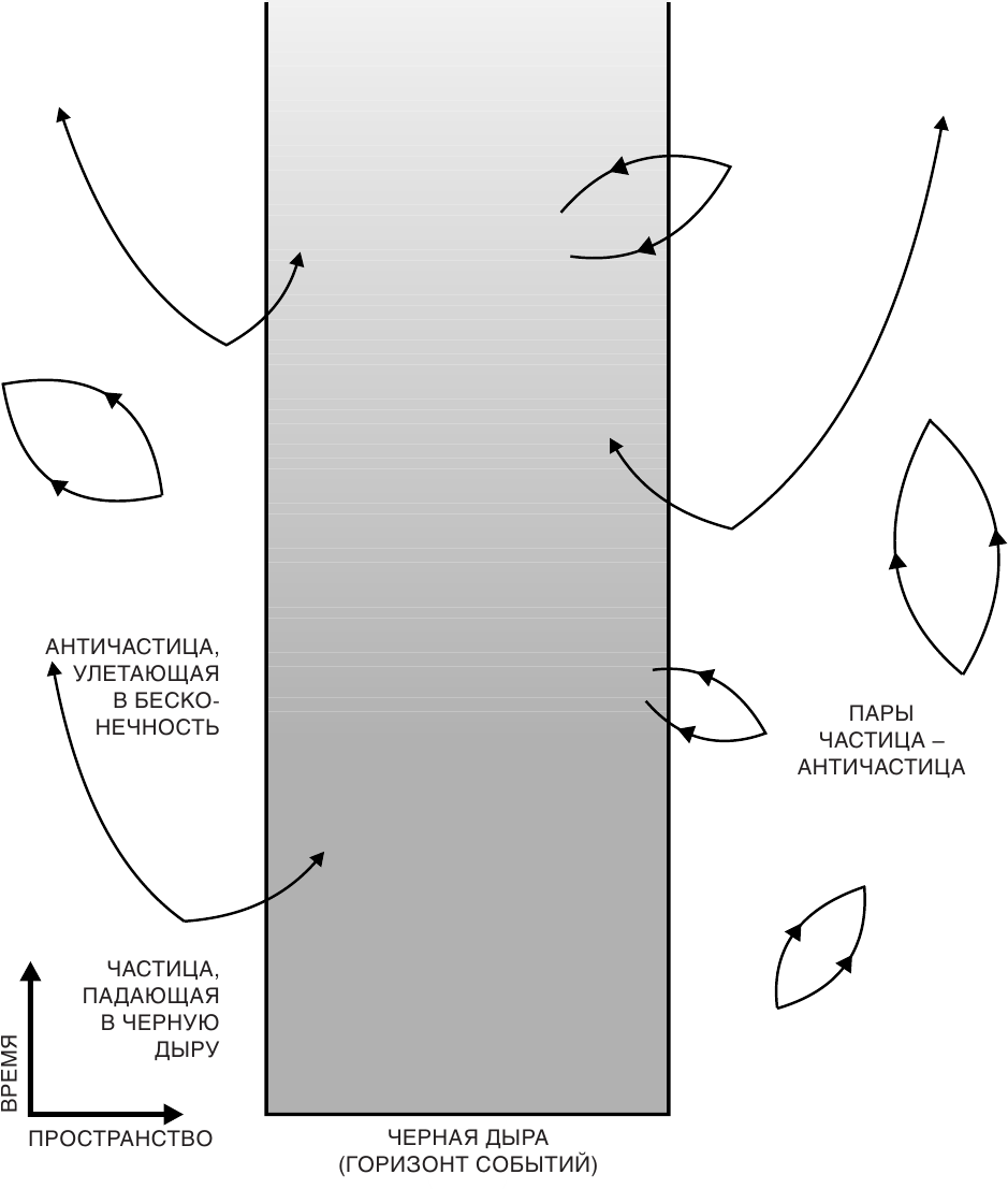 Как же черная дыра может испускать частицы, если мы знаем, что ничто не выходит из нее за горизонт событий? Дело в том, говорит нам квантовая механика, что частицы выходят не из самой черной дыры, а из «пустого» пространства, находящегося перед горизонтом событий! Вот как это можно понять: то, что мы представляем себе как «пустое» пространство, не может быть совсем пустым, так как это означало бы, что все поля, такие как гравитационное и электромагнитное, в нем точно равны нулю. Но величина поля и скорость его изменения со временем аналогичны положению и скорости частицы: согласно принципу неопределенности, чем точнее известна одна из этих величин, тем менее точно известна вторая. Следовательно, в «пустом» пространстве поле не может иметь постоянного нулевого значения, так как тогда оно имело бы и точное значение (нуль), и точную скорость изменения (тоже нуль). Должна существовать некоторая минимальная неопределенность в величине поля – квантовые флуктуации. Эти флуктуации можно себе представить как пары частиц света или гравитации, которые в какой-то момент времени вместе возникают, расходятся, а потом опять сближаются и аннигилируют друг с другом. Такие частицы являются виртуальными, как частицы, переносящие гравитационную силу Солнца: в отличие от реальных виртуальные частицы нельзя наблюдать с помощью детектора реальных частиц. Но косвенные эффекты, производимые виртуальными частицами, например небольшие изменения энергии электронных орбит в атомах, можно измерить, и результаты удивительно точно согласуются с теоретическими предсказаниями. Принцип неопределенности предсказывает также существование аналогичных виртуальных пар частиц материи, таких как электроны или кварки. Но в этом случае один член пары будет частицей, а второй – античастицей (античастицы света и гравитации – это то же самое, что и частицы).