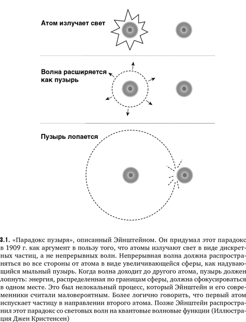 Например, предположим, что свет — это все-таки волна, но производит впечатление, что он частица, поскольку атомы поглощают энергию волны дискретными порциями. Большинство современников Эйнштейна приняло это описание. Но Эйнштейн очень рано увидел, что это противоречит тому, что физик Джон Крамер из Вашингтонского университета назвал «парадоксом пузыря». Волна распространялась бы от источника, как раздувающийся пузырь. Когда она достигает атома, пузырь лопается: волна разрушается и концентрирует всю свою энергию в одном месте, как морская волна, врывающаяся в узкую бухту. К тому моменту пузырь может быть огромным — разрушение волны внезапно произошло бы в обширной области пространства. Как удаленные друг от друга части пузыря узнали бы, что они должны прекратить распространяться дальше? Здесь должен быть задействован какой-то таинственный нелокальный эффект.