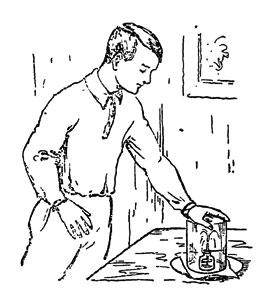В небольшую скляночку у меня налита вода, подкрашенная в синий цвет щелочным раствором лакмуса. Склянка закупорена пробкой с пропущенной через нее соломинкой. На тарелку кладу несколько влажных листков промокательной бумаги и обливаю их небольшим количеством слабой соляной кислоты. Беру большую стеклянную банку и удаляю из нее часть воздуха нагреванием над керосиновой лампой, держа над ее стеклом банку горлом вниз. Можно держать банку и над пламенем свечи или спиртовой лампочки так, чтобы пламя было как раз в середине банки. Горячую банку ставлю на тарелку, плотно прижав ее к влажной бумаге (рис. 43). По мере остывания воздуха, в банке образуется разреженное пространство, и вода из пузырька бьет в банке струйкой вверх, окрашиваясь парами соляной кислоты в красный цвет. Опыт не всегда сходит так удачно. Банка при перемене температуры может лопнуть. Надежнее брать большой, так называемый химический стакан (тонкостенный сосуд, выносящий быструю перемену температуры), но на него не следует сильно надавливать: он хрупок, и, сломав его, вы можете поранить себе руку.