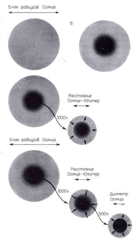 Рис. 12.2. Модель образования Солнца по Ларсону. Облако межзвездной пыли начинает сжиматься (а). Вначале плотность внутри него почти везде одинакова. Через 390000 лет в центре облака плотность увеличивается в 100 раз (б). Через 423000 лет после начала процесса в центре уплотнения появляется горячее ядро, которое поначалу перестает сжиматься (в). На рисунке оно показано в увеличенном масштабе. Его плотность в 10 миллионов раз выше первоначальной. Основная доля массы, однако, как и раньше, приходится на окружающее его сжимающееся облако. Через короткое время молекулы водорода в ядре распадаются на атомы, ядро снова сжимается и образуется новое ядро, которое имеет размеры Солнца (на рисунке увеличено вдвое) (г). Хотя вначале его масса невелика, в конце концов все вещество облака переходит к нему. Ядро в центре разогревается до такой степени, что начинается термоядерная реакция водорода и оно становится звездой главной последовательности с массой, равной солнечной.