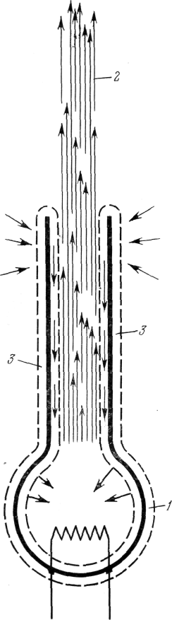 Из этих опытов мы получили картину движения жидкого гелия в капилляре, производимого потоком тепла. Схема этого движения представлена на рисунке на стр. 36. В бульбочке 1 происходит нагревание гелия, в капилляре происходит поток, и он вырывается наружу в виде струи 2. Входящий гелий ползет по стенке капилляра в обратном направлении в виде тонкой поверхностной пленки 3, а в бульбочке происходит переход гелия с поверхности опять в свободный гелий. Таким образом, мы имеем тут явление ползания гелия по поверхности, очень похожее на то, о котором мы уже говорили вначале и которое объясняет выравнивание уровней гелия из сосудика, изображенного на рисунке на стр. 28. Нужно отметить, что в обоих случаях такое движение гелия возможно только, если жидкий гелий-II при своем течении ведет себя как жидкость, не обладающая вязкостью.