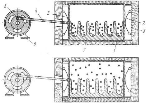 Посредством шатуна 4 и кривошипа 5, сидящих на оси маленького электромотора 6, рамку можно заставить совершать горизонтальные колебания. При этом, как вы видите, шарики начнут бегать между стеклами. Их движение напоминает собой движение атомов при тепловом возбуждении. Чем быстрее мы заставляем колебаться рамку, тем скорее бегают шарики, и тем картина движения ближе соответствует более высокой температуре.