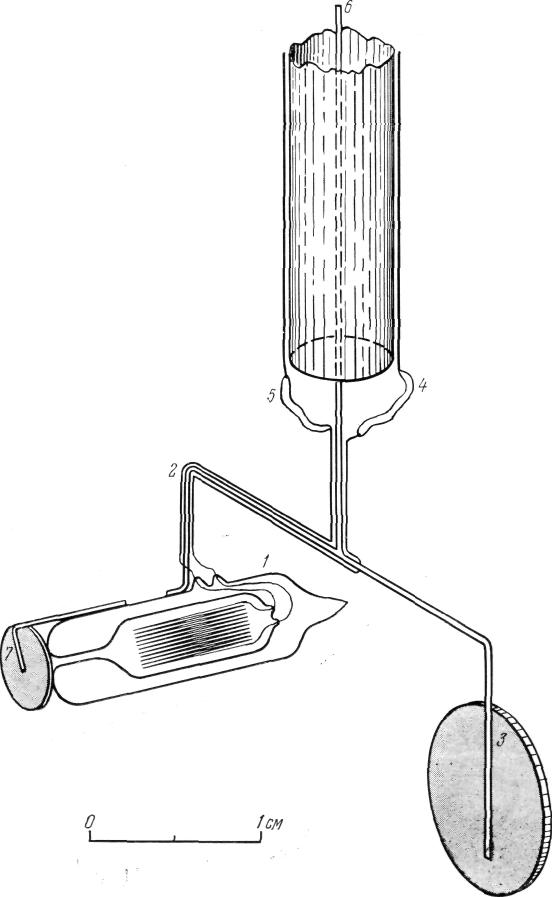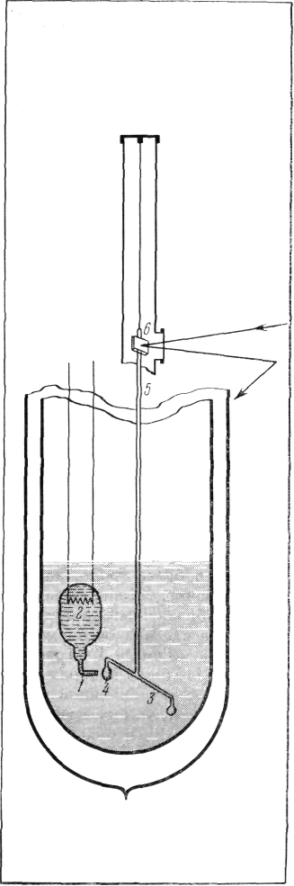 Сила давления гелия могла быть измерена по закручиванию кварцевой нити, которое определяли по смещению зайчика от зеркала 6, прикрепленного к стеклянной палочке 5.