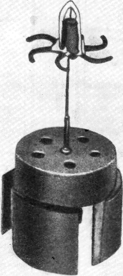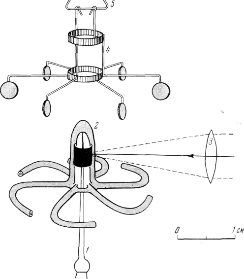 Если теперь, опуская петлю 5, надеть на наш паучок два очень легких колечка 4, к которым на тоненьких проволочках прикреплены по числу капилляров 6 дисков так, что каждый из дисков прикроет на расстоянии 1—2 мм отверстие каждого капилляра, то мы увидим, что и таком состоянии наш паучок, когда мы будем подогревать гелий пучком света, не будет уже вращаться. Фотография этого приборчика показана на рисунке справа.
