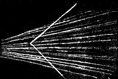 Этот фотоснимок сделан специальным аппаратом, называемым «камера Вильсона». На снимке запечатлены следы быстро движущихся ядер. Два ядра разлетаются в разные стороны.