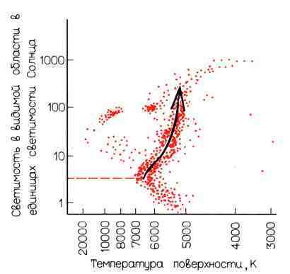 На рис. 5.4 изображена диаграмма Г-Р для звезд главной последовательности шарового скопления МЗ. На этой диаграмме черной стрелкой изображен путь развития звезд, подобных Солнцу. Из рис. 5.4 хорошо видно, что звезды шарового скопления развиваются так же, как будет развиваться Солнце в будущем. На диаграмме показаны звезды, которые уже перемещаются по диаграмме направо вверх. Такая судьба постигнет и Солнце через 8 миллиардов лет. Более тяжелые звезды опережают Солнце, они уже сегодня показывают нам, что ожидает в будущем наше Солнце. И если на некоторых планетах, образующихся вокруг этих звезд, когда-то была жизнь, то теперь эта жизнь там уже не существует, и все ее следы давно сгорели в потоке тепла, который испускают эти звезды. Таким образом, астрономические наблюдения подтверждают, что наши предсказания дальнейшей судьбы Солнца, к сожалению, правильны.