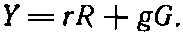 Открытое нами явление аналитически можно записать следующим образом. Обозначим данный желтый цвет символом Y; он представляет собой сумму некоторых количеств света от красного фильтра (R) и от зеленого (G). С помощью двух чисел, скажем r и g, определяющих яркости (R) и (G), формула для желтого цвета записывается в виде