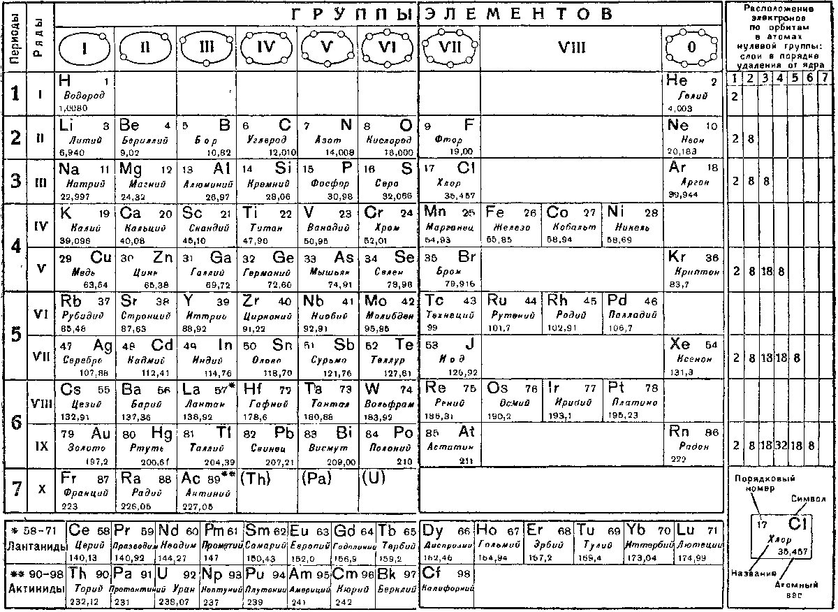 На рис. 2 приведена современная периодическая система химических элементов. В ней все элементы расположены в десяти горизонтальных рядах, составляющих семь периодов — коротких и длинных, и в девяти вертикальных столбцах — группах.