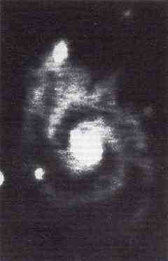 От этой галактики идет к нам радиоизлучение. Быстро движущиеся электроны, которые приобрели огромную скорость, по всей видимости, в результате взрывов сверхновых, пролетают сквозь звездную систему, испуская при этом радиоволны. Эти радиоволны принимаются чувствительными радиотелескопами. Можно даже определить, из каких областей галактики излучение сильнее, а из каких слабее. В 1971 г. радиоастрономы Дональд Мэтьюсон, Пит ван дер Крюйт и Вим Броув в Голландии получили радиоизображение этой галактики (рис. 12.7). На этом снимке интенсивность радиоизлучения передается участками различной плотности: чем сильнее радиоизлучение, тем светлее участок снимка. Хотя радиотелескоп дает не столь резкую картину, как оптический телескоп, на снимке хорошо видна спиральная структура. Таким образом, спиральные рукава излучают не только видимый свет, но и радиоволны.