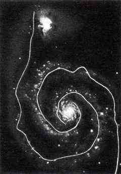 Рис. 12.8. Области максимального радиоизлучения (схематически прорисованные белыми линиями), наложенные на оптическое изображение галактики в созвездии Гончих Псов. Видно, что спиральные рукава максимальной плотности газа и спиральные структуры, образуемые молодыми звездами, не вполне совпадают. Таким образом, следует различать рукава плотности (радиорукава) и видимые рукава галактики.
