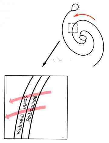 Туманность в созвездии Гончих Псов показывает нам и кое-что еще. Можно заметить, что области максимальной интенсивности радиоизлучения не вполне точно совпадают с видимыми рукавами спирали (рис. 12.8). Область наибольшей плотности межзвездного газа слегка смещена внутрь по отношению к видимому рукаву. Что бы это означало? Сквозь спиральные рукава идет поток звезд и межзвездного газа, причем этот поток пересекает рукав так, что входит в него с «внутренней» (обращенной к центру) стороны, а выходит с внешней. Сравнение видимого рукава, подсвечиваемого новорожденными звездами, и радиорукава, соответствующего области максимального сжатия межзвездного газа, позволяет составить следующую картину.