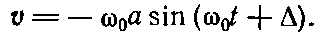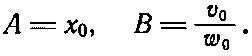 Давайте выясним, какой смысл имеют А и В или а и ?. Конечно, они показывают, как началось движение. Если движение начнется с малого отклонения, мы получим один тип колебаний; если слегка растянуть пружинку, а потом ударить по грузику — другой. Постоянные А и В или а и ?, или какие-нибудь две другие постоянные определяются обстоятельствами, при которых началось движение, или, как обычно говорят, начальными условиями. Нужно научиться определять постоянные, исходя из начальных условий. Хотя для этого можно использовать любое из соотношений (21.6), лучше всего иметь дело с (21.6в). Пусть в начальный момент t=0 грузик смещен от положения равновесия на величину х0 и имеет скорость v0. Это самая общая ситуация, какую только можно придумать. (Нельзя задать начального ускорения, потому что оно зависит от свойств пружины; мы можем распорядиться только величиной х0.) Вычислим теперь А и В. Начнем с уравнения для