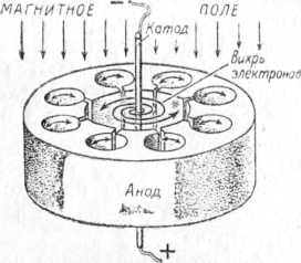 Оба электрода находятся в сильном магнитном поле, направленном так, что его силовые линии пронизывают пространство между анодом и катодом вдоль их оси.
