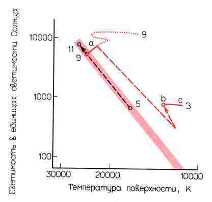 Этот расчет был первым из произведенных нами. Исходными послужили две звезды с массой в 9 и 5 солнечных, обращающиеся одна относительно другой с периодом 1,5 суток на расстоянии 13,2 солнечных радиуса. Поначалу эволюционирует более массивная компонента; скорость эволюции менее массивной компоненты сравнительно мала. По мере того, как звезда с массой в 9 солнечных масс расходует все большую и большую долю своего водорода, ее внешняя оболочка медленно расширяется. Через 12,5 миллионов лет количество водорода в центре звезды уменьшается примерно наполовину, и к этому времени звезда расширяется настолько, что подходит к границам своей полости Роша. На диаграмме Г-Р (рис. 9.4) ее теперешнее состояние изображается точкой а. Дальнейшее расширение звезды становится невозможным: ее вещество должно переходить к спутнику.
