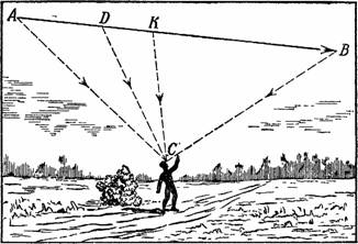 Вот результат: то, что мы услышим, будет вовсе не похоже на то, что мы увидим. Для глаза болид появится прежде всего в точке A и отсюда пролетит по линии AB. Но для уха болид появится прежде всего где-то над нашей головой в точке K, затем мы услышим в одно время два звука, затихающие по противоположным направлениям — от: K к A и от K к B. Другими словами, мы услышим, как болид словно распался на две части, которые унеслись в противоположные стороны. Между тем в действительности никакого взрыва не происходило. Вот до чего обманчивы могут быть слуховые впечатления! Возможно, что многие засвидетельствованные «очевидцами» взрывы болидов — именно такого рода обманы слуха.