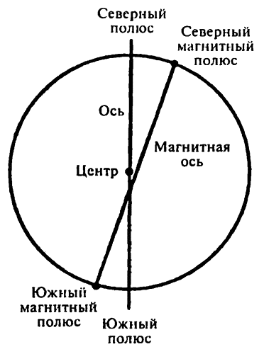 Эти два магнитных полюса находятся не совсем на противоположных концах Земли, так что соединяющая их линия (магнитная ось) не только составляет угол в 18° с осью географической, но также и не проходит через центр Земли.