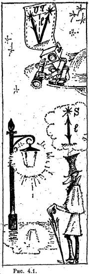 При помощи ультрасовершенного секундомера можно зафиксировать два мгновения: первое, когда свет отправился в путешествие, и второе, когда он пришел к фотоэлементу. Два наблюдателя следят за этим явлением. Один находится тут же рядом с выдуманной нами установкой, а второго художник поместил на далекую звезду. Оба измеряют интервал времени τ между двумя событиями: уходом и возвращением света в точку S. Первый наблюдатель чертит картинку хода луча, проще которой и выдумать нельзя. Он полагает, что пути луча туда и обратно полностью совпадают. В справедливости своего рассуждения он убеждается с помощью равенства τ = 2∙l/с.