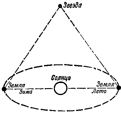 Фиг. 5.5. Определение расстояния до ближайшей звезды методом триангуляции. В качестве базы используется диаметр орбиты Земли.