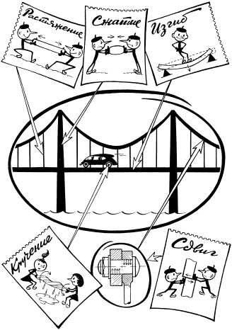 Какие нагрузки приходится испытывать деталям машин, частям конструкции в их, так сказать, практической жизни? Да самые различные! Но все их можно свести к нескольким простым. Вот они.