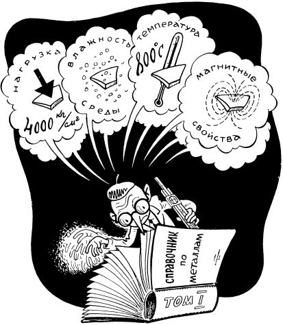 А сколько хлопот доставит инженеру выбор материала для тех частей его машины, (которым придется работать при температуре в 800 градусов! Он пытается обеспечить их охлаждение струей холодного воздуха, прокачиваемой по трубам водой. Ничего не получается, весь «тепловой удар» придется принять на себя материалу конструкции. Он открывает специальную главу справочника, где собраны характеристики жаропрочных материалов. Здесь сообщается не только о прочности их при комнатной температуре, но и об их поведении при температуре в 300, 600, 800 градусов… Нелегкое дело подобрать материал для таких сложных условий работы!
