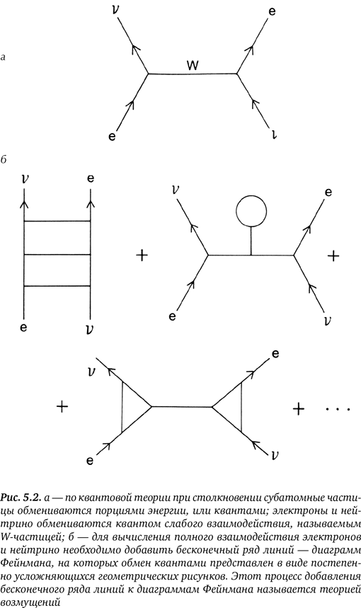 Проблема возникла, так как физики, вычисляя, что произойдёт при столкновении двух частиц, пользовались так называемой теорией возмущений, т. е. завуалированным способом указать, что они прибегали к хитроумным приближениям. К примеру, на рис. 5.2, а мы видим, что происходит при столкновении электрона с другой частицей, участвующей в слабом взаимодействии, — неуловимым нейтрино. На первый взгляд, это взаимодействие можно описать диаграммой (она называется «диаграммой Фейнмана»), показывающей, что обмен квантом слабого взаимодействия — W-частицей — происходит между электроном и нейтрино. В первом приближении мы получаем грубое, но приемлемое соответствие экспериментальным данным.
