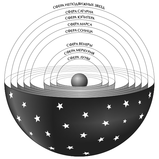 Аристотель считал Землю неподвижной, а также полагал, что Солнце, Луна, планеты и звезды обращаются по круговым орбитам вокруг Земли. Он руководствовался мистическими соображениями: Земля, по Аристотелю, является центром Вселенной, а движение по кругу наиболее совершенно. Во II веке нашей эры Птолемей построил на основе этой идеи всеобъемлющую космологическую модель. В центре Вселенной находилась Земля, окруженная восемью вложенными друг в друга вращающимися сферами, и на этих сферах располагались Луна, Солнце, звезды и известные в то время пять планет – Меркурий, Венера, Марс, Юпитер и Сатурн (рис. 1.1). Каждая планета двигалась относительно своей сферы по малому кругу – для того, чтобы описать весьма сложные траектории этих светил на небе. На самой внешней сфере были закреплены звезды, и поэтому взаимные положения звезд оставались неизменными, конфигурация звезд вращалась на небе как единое целое. Представления о том, что расположено за пределами самой внешней сферы, оставались весьма расплывчатыми, но это заведомо находилось за пределами наблюдаемой для человечества части Вселенной.