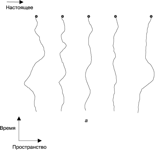 Рис. 8.2 (начало). Как специальная теория относительности приводит к полям: а — здесь изображены мировые линии нескольких частиц, показывающих, как их положения (горизонтальная ось) меняются с течением времени (вертикальная ось)