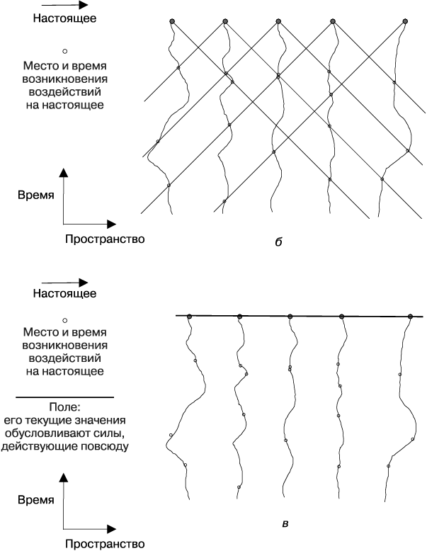 Теперь рассмотрим рис. 8.2. На рис. 8.2, а изображены мировые линии нескольких частиц. Их пространственные положения отмечены на горизонтальной оси, а моменты времени — на вертикальной. Со временем положения частиц изменяются. Положения частицы, меняющиеся во времени, составляют мировую линию этой частицы. Разумеется, у нас должно быть три пространственных измерения, однако даже два — это слишком много для плоской страницы, и, к счастью, нам достаточно одного, чтобы донести свою мысль. На рис. 8.2, б вы видите, что, если воздействие распространяется с конечной скоростью, то воздействие, например, частицы А на частицу В зависит от того, где частица B находилась раньше. Таким образом, чтобы вычислить совокупную силу, воздействующую на частицу, мы должны суммировать воздействия всех остальных частиц, поступающих из различных прежних времен. Это усложняет описание, как показано на рис. 8.2, в. Альтернативный подход также изображен на рис. 8.2, в. Он заключается в том, чтобы забыть об отслеживании отдельных прошлых положений и вместо этого сосредоточиться на совокупном воздействии. Другими словами, мы следим за полем, представляющим совокупность воздействий.
