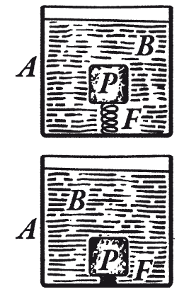 4. Закон Архимеда утрачивает свое значение при падении системы. Представим себе, что в сосуд с водою погружена пробка (рис. 61). Пружина удерживает ее в воде вопреки давлению жидкости снизу вверх, повинуясь которому пробка всплыла бы наверх. Во время падения сосуда с пробкой А этого давления снизу вверх нет (так как давление жидкости обусловлено в данном случае ее весомостью), и пробка опускается вниз (Любимов Н.А. Из физики системы, имеющей переменное движение).