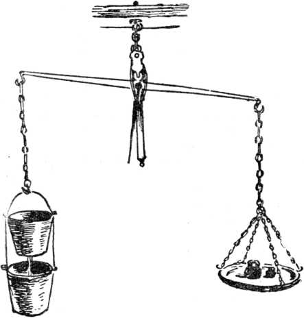 С одного коромысла больших торговых весов ученый снял чашку и вместо нее подвесил два ведерка — одно под другим. В донышке верхнего ведра имелось небольшое отверстие, которое Галилей заткнул пробкой. В верхнее ведро он налил воды, а на чашку весов, свисавшую с другого конца коромысла, наложил гирь, чтобы уравновесить вес ведер. Затем осторожно извлек пробку из отверстия, и вода струйкой потекла из верхнего ведра в нижнее.