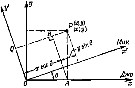 Произвольная точка Р снабжается координатами (x, y) в системе Джо и (х', у') в системе Мика. Как и в предыдущем случае, начнем с того, что выразим координаты х' и у' через x, y и ?. Для этого опустим из Р перпендикуляры на все четыре координатные оси и проведем АВ перпендикулярно PQ. Из чертежа ясно, что х' можно представить как сумму двух отрезков вдоль оси х', а у' — как разность двух отрезков вдоль АВ. Длины этих отрезков выражаются через x, y и 6; мы добавляем еще уравнение для третьей координаты: