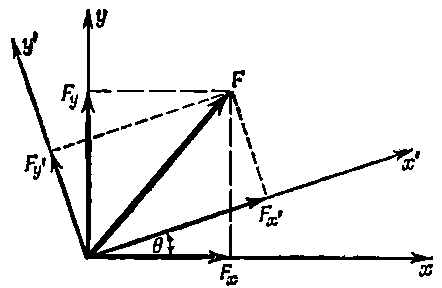 Составляющая Fx, как и Fy, имеет составляющие вдоль обеих осей х' и у'. Чтобы выразить Fx' через Fx и Fy , сложим составляющие этих сил вдоль оси х'; точно таким же образом можно выразить и Fy' через Fx и Fy . В результате получим