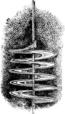 Возвращаясь теперь к мыльным пузырям, вспомним, что, как нами было установлено, катеноид и плоскость являются единственными поверхностями вращения, у которых нет кривизны и которые поэтому и в том случае, когда они образованы упругими перепонками, не производят давления. Существует множество других поверхностей, которые кажутся кривыми во всех направлениях и все же не имеют кривизны, а потому и не производят давления; но это не будут тела вращения, то есть их нельзя получить простым вращением некоторой кривой линии вокруг оси. Некоторое количество таких тел можно получить при помощи проволочных рамок различной формы, погружая их в мыльную воду. Вынимая рамки из воды, мы увидим удивительное разнообразие поверхностей без кривизны. Одна из таких поверхностей известна под названием винтовой поверхности. Чтобы получить ее, нужно лишь взять кусок проволоки, закрутить ее несколько раз в открытый завиток (называемый обыкновенно спиралью) и загнуть оба конца таким образом, чтобы они встретили другую, прямую проволоку, представляющую ось этой спирали. Винтовая поверхность, полученная погружением в мыльную воду проволочного прибора, стоит того, чтобы на нее посмотреть (рис. 47).