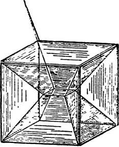 Это и не удивительно, если принять во внимание, что сама проволочная фигура трехсторонняя. Рассматривая эту трехстороннюю фигуру с тремя пленками, встречающимися на центральной линии, вы склонны ожидать, что в случае четырехсторонней или квадратной призмы мы увидим четыре пленки, встречающие одна другую на средней линии. Замечательно, однако, что этого никогда не происходит, какую бы неправильную форму ни имела рамка и какое бы сложное строение ни имел клочок пены. На одном ребре никогда не может встретиться более трех плоскостей, а в одной точке — четырех ребер и шести плоскостей. Кроме того, пленки и ребра должны пересекать друг друга лишь под равными углами. Если случайно на один момент в одном ребре встретятся четыре плоскости или если углы не будут в точности равны друг другу, тогда получится во всяком случае неустойчивая форма; она не может оставаться в покое, и пленки будут все время скользить одна вдоль другой, пока они не придут в положение, при котором условия устойчивости будут выполнены В результате кубическая форма дает фигуру, изображенную на рис. 49, в которой центральный квадрат должен быть параллельным одной из шести граней куба и двенадцать других пленок встречаются одна с другой так, что выполняется основное правило, а именно: все углы равны 120°.