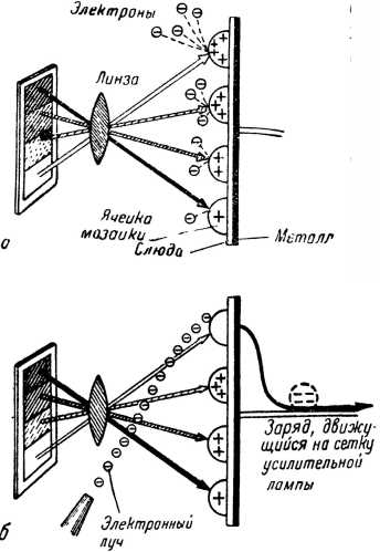 Пробегая по всем фотоэлементам фотокатода и «стирая» один за другим положительные заряды на этих фотоэлементах, электронный луч освобождает соответствующие им по величине стайки электронов в металлической пластинке.