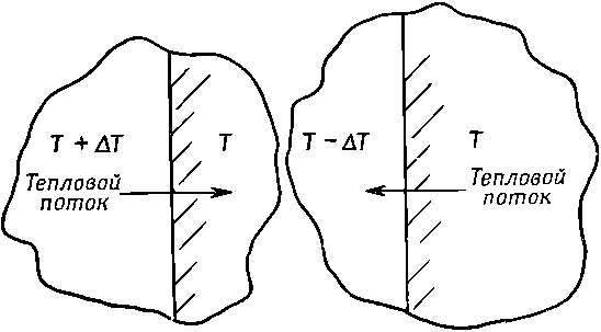 А теперь обсудим аналог движения без трения — «лишенный трения» перенос тепла. Если мы приложим горячее тело к телу, обладающему более низкой температурой, то возникнет тепловой поток. Тепло течет от горячего тела к холодному, и, чтобы повернуть поток вспять, нужно слегка изменить температуру какого-нибудь одного тела. Но машина, лишенная трения, будет под действием сколь угодно малой силы послушно двигаться туда, куда ей приказывают, а когда сила будет действовать в другую сторону, охотно последует за ней. Аналогом машины без трения может служить устройство, в котором бесконечно малые изменения температуры могут повернуть тепловой поток вспять. Если разность температур конечна, то это невозможно. Но если тепло течет между двумя телами практически при одинаковой температуре и достаточно бесконечно малого изменения температуры, чтобы поток повернул в любом направлении, то поток считается обратимым (фиг. 44.4).