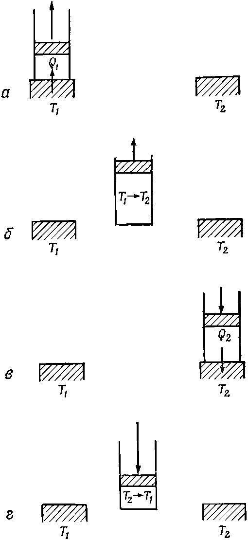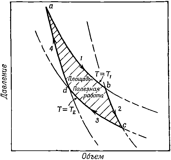 По этой диаграмме судя, газ совершил полный цикл, отняв за это время тепло Q1 при температуре T1 и отдав тепло Q2 при температуре T2. Этот цикл обратим, и поэтому мы можем шаг за шагом проделать весь путь в обратном направлении. Мы могли бы пойти назад, а не вперед, могли бы начать движение из точки а при температуре T1, двигаться по кривой 4, затем поглотить тепло Q2 при температуре T2 (для этого надо все время выдвигать поршень) и т. д., пока цикл не будет завершен. Если мы совершали цикл в одном направлении, то заставили газ работать, если же нам захотелось повернуть назад, то придется поработать самим.
