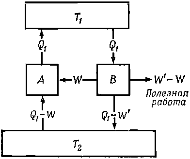 Обладая работой W, можно запустить машину А в обратном направлении, ведь это — обратимая машина. При этом она поглотит какое-то количество тепла из резервуара с температурой Т2, но зато вернет тепло Q1 резервуару при температуре Т1. Каков чистый результат этого двойного цикла? Мы вернули все к исходному состоянию и совершили дополнительную работу W'-W. Дело свелось к тому, что мы извлекли энергию из резервуара с температурой Т2! Тепло Q1, взятое из резервуара с температурой T1, было аккуратно возвращено. Раз это тепло все равно возвращается, то в качестве резервуара с температурой Т1 можно взять что-нибудь поменьше океана и заключить это устройство внутрь составной машины А+В. Чистым результатом цикла такой машины будет изъятие из резервуара при температуре Т2 тепла W'-W и превращение его в работу. Но извлечение полезной работы из резервуара при неизменной температуре без других изменений запрещается постулатом Карно. Этого нельзя сделать. Таким образом, не существует таких машин, которые извлекли бы некоторое количество тепла из резервуара при температуре Т1, возвратили бы какую-то его часть при температуре Т2 и совершили большую работу, чем обратимая машина, работающая при тех же самых температурных условиях.