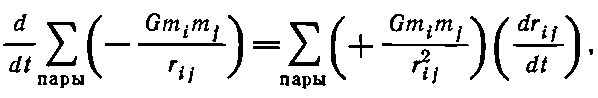 Как же это доказать? Мы продифференцируем обе стороны по времени и докажем, что получится нуль. При дифференцировании 1/2mivi2 мы получим производные скорости — силы [как в (13.5)], а потом эти силы заменим их величиной, известной нам из закона тяготения, и увидим в конце концов, что останется как раз производная по времени от