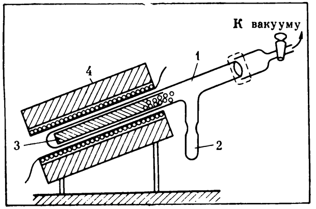 1 — стеклянная трубка длиной 30–35 см; 2 — патрубок для сбора металлического цезия (по окончании процесса отпаивается); 3 — железная пробирка с исходными компонентами (смесь хлорида цезия и металлического кальция); 4 — электрическая печь