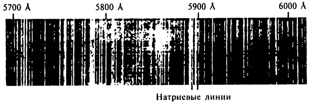 Темные линии в солнечном спектре, кажется, являются спектром поглощения. Пылающее тело Солнца достаточно сложно по химической структуре, чтобы создавать непрерывный спектр. Проходя через несколько более холодную его атмосферу, свет частично поглощается. Те части, которые поглощаются сильнее и которые на спектре будут выглядеть как темные линии, соответствуют спектру испускания элементов, которых больше всего в солнечной атмосфере. Так, в солнечном спектре есть явные линии поглощения натрия (Фраунгофер обозначил их как «линию D»), и это — убедительное свидетельство присутствия натрия в солнечной атмосфере.