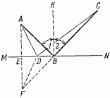 Ввиду этого мы можем путь АВС заменить равным ему путем CBF (так как AB = FB), a путь ADC — путем CDF. Сравнивая же между собой длины CBF и CDF, видим, что прямая линия CBF короче ломаной CDF. Отсюда путь АВС короче ADC, что и требовалось доказать!